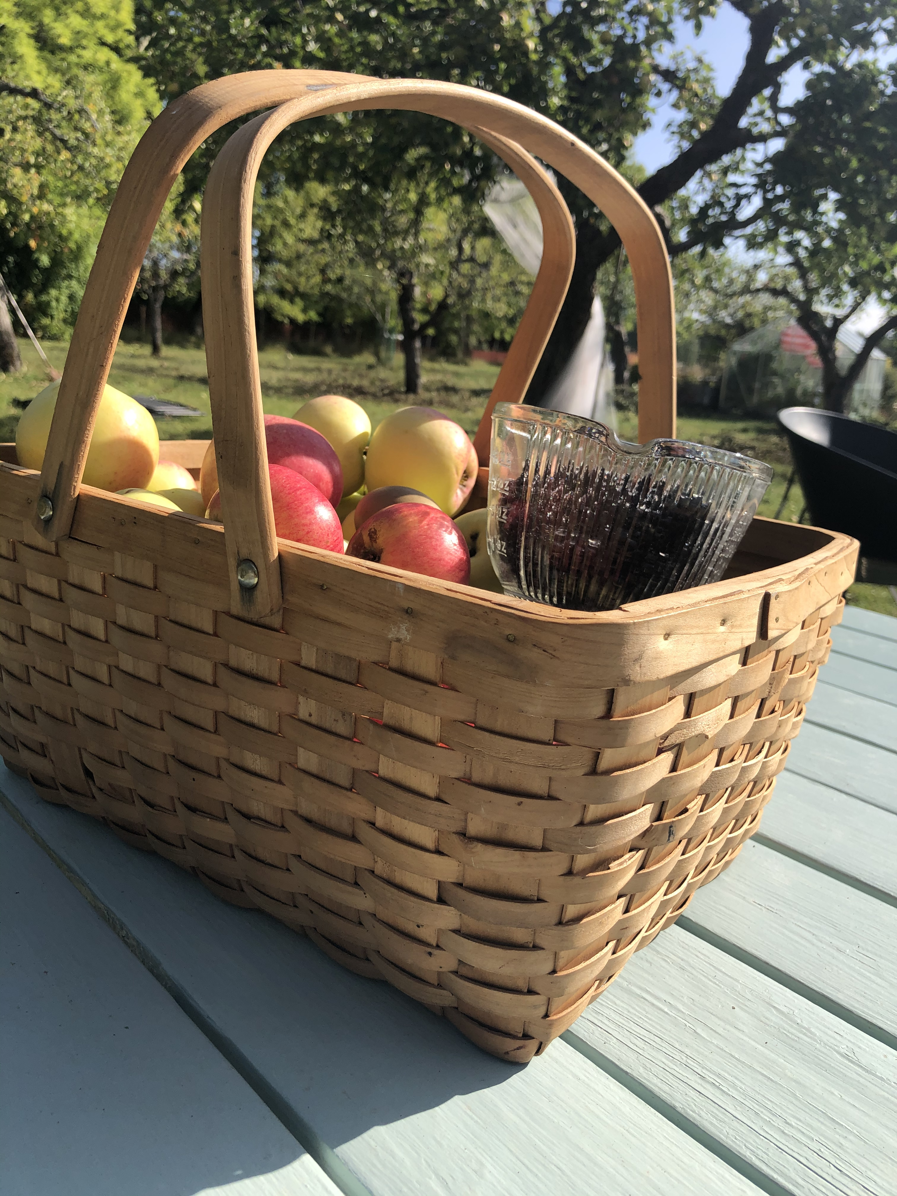 Äppelträden ger oss förutom skugga, surrande från bin och humlor och väldoftande blommor goda skördar som i köket kokas till godsaker och dryck. Vi har de senaste åren också lämnat in äpplen för mustning hos Köpings musteri.
