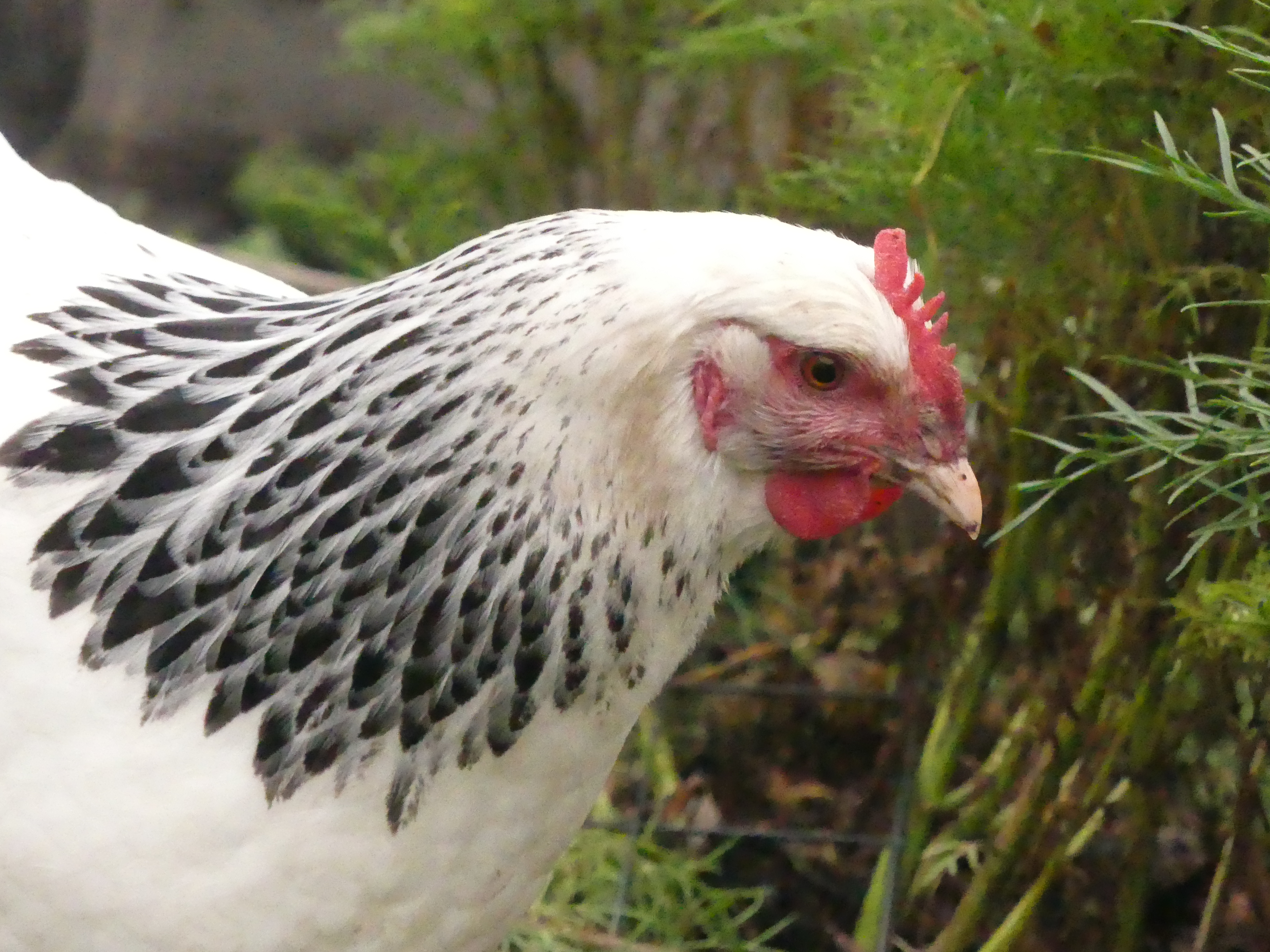 Den vita hönan heter Meghan Markle och är av rasen Sussex med rosa ägg.